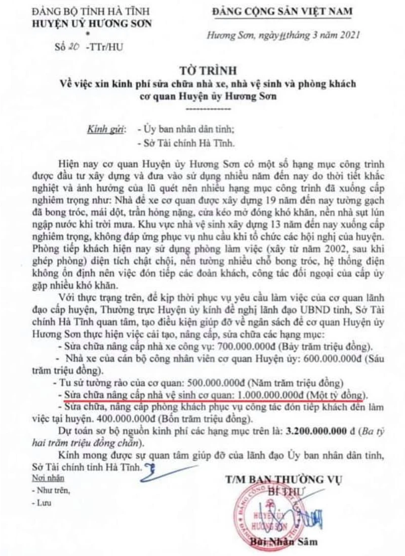 Ngày 29-3, trên mạng xã hội đăng hình ảnh văn bản tờ trình về việc xin kinh phí sửa chữa nhà giữ xe, nhà vệ sinh và phòng khách cơ quan huyện ủy Hương Sơn (Hà Tĩnh).