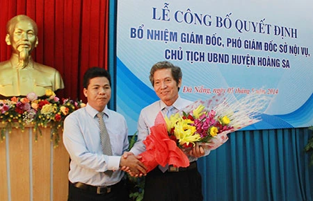 Tân Chủ tịch UBND huyện Hoàng Sa Võ Công Chánh (trái) trao hoa chia tay người tiền nhiệm Đặng Công Ngữ. Ảnh: LÊ PHI