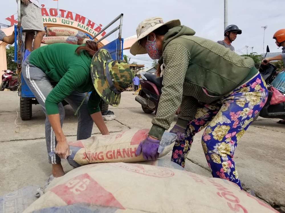 Người dân phải vác từng bao xi măng lên xe bò kéo về nhà vì phà hư, xe tải không thể qua sông. Ảnh: THANH NHẬT