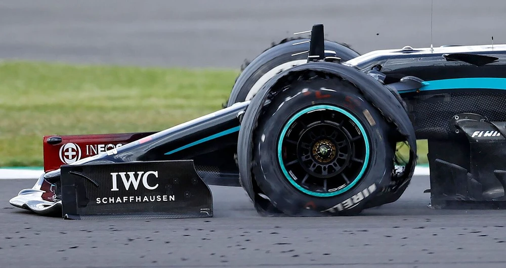 Tay đua Anh Lewis Hamilton điều khiển “con quái thú” F1 trong thế bánh trước bên trái bị bể ở vòng chạy cuối cùng. Tuy nhiên, anh vẫn về đích sớm nhất để thắng chặng British Grand Prix tại trường đua Silvester Circuit tối 2-8.