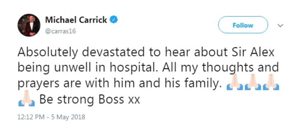 Đội trưởng MU - Michael Carrick thể hiện tình cảm với Sir Alex trong thông điệp gửi trên trang mạng xã hội cá nhân" “Tôi hoàn toàn bất ngờ khi hay tin Sir Alex không khỏe và phải nhập viện. Bây giờ tất cả những suy nghĩ của tôi đều hướng về ông ấy. Tôi cầu nguyện cho ông ấy và gia đình. Hãy mạnh mẽ lên, ông chủ”.