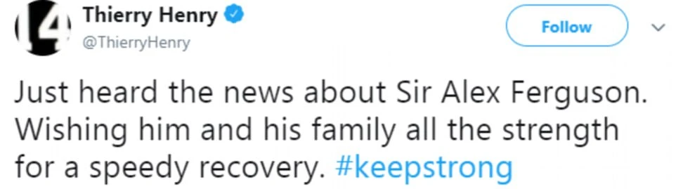 HLV Arsene Wenger của Arsenal nói với Daily Mail (Anh): “Tôi rất lo lắng. Tôi đang nghĩ về ông ấy và gia đình ông ấy. Tôi tin rằng với sức mạnh tinh thần và là một con người mạnh mẽ, Sir Alex sẽ nhanh chóng hồi phục”.