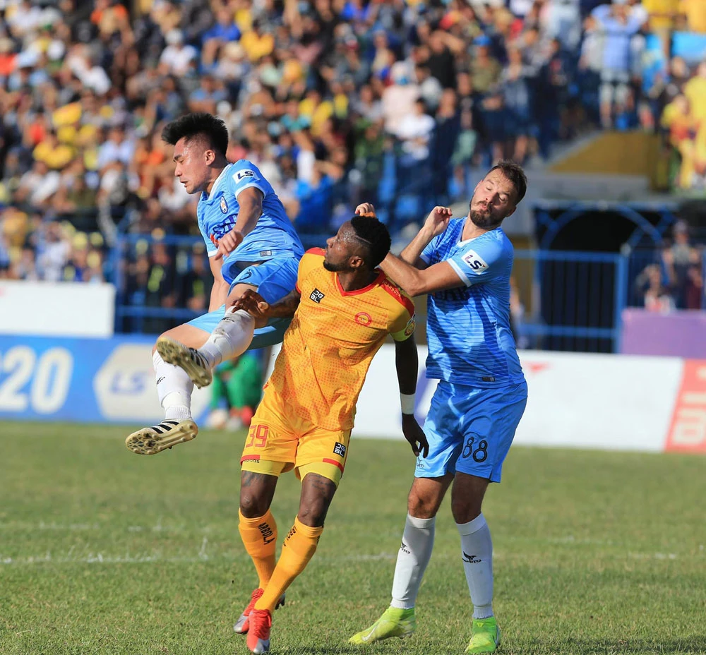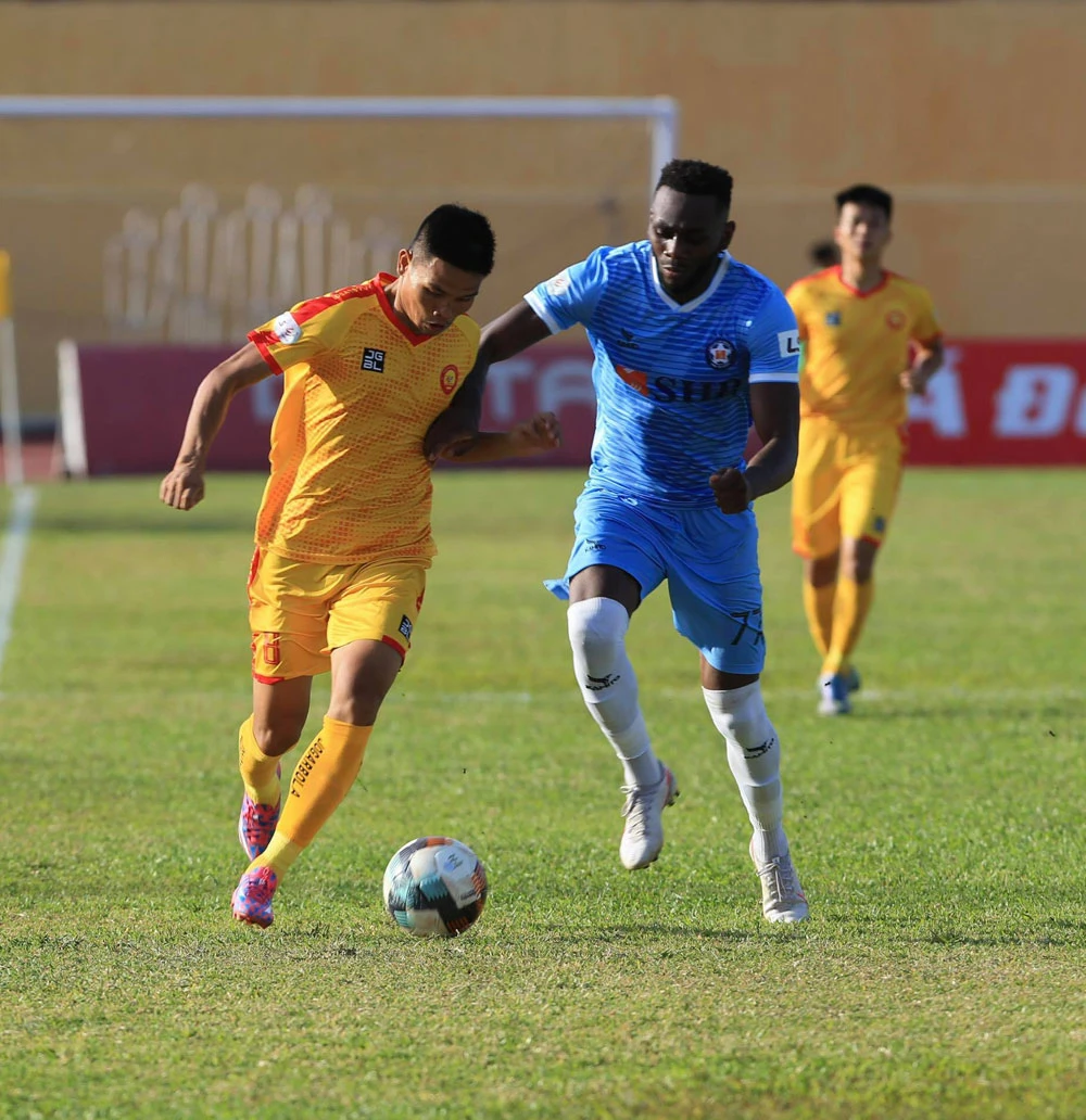 Hoàng Vũ Samson (giữa, Thanh Hóa) không thể ghi bàn. Ảnh: VPF