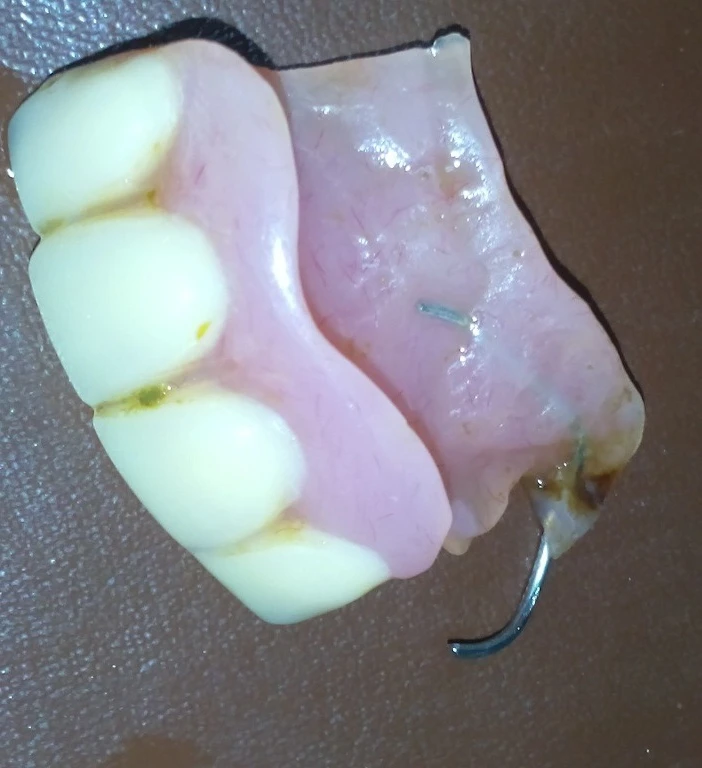 Tại đây, các bác sĩ phòng khám tiến hành nội soi dạ dày và phát hiện có dị vật là một hàm răng giả (4 răng kèm móc sắt), kẹt tại lỗ môn vị, gây ra phù nề, xung huyết. Liền sau đó các bác sĩ và điều dưỡng đã tiến hành lấy “gọn” hàm răng giả kèm cả móc sắt ra khỏi dạ dày bệnh nhân.