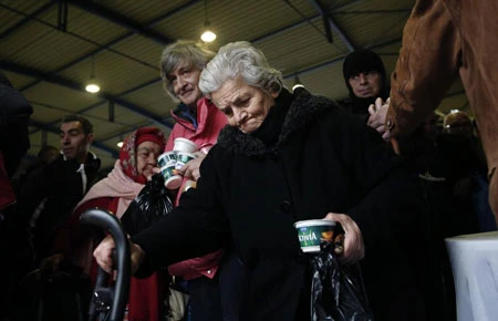Người vô gia cư cầm thức ăn từ thiện được chính quyền Athens phân phát trong ngày đầu năm 1-1-2014. Khủng hoảng đã làm lượng người vô gia cư ở Hy Lạp tăng cao. Ảnh: AP