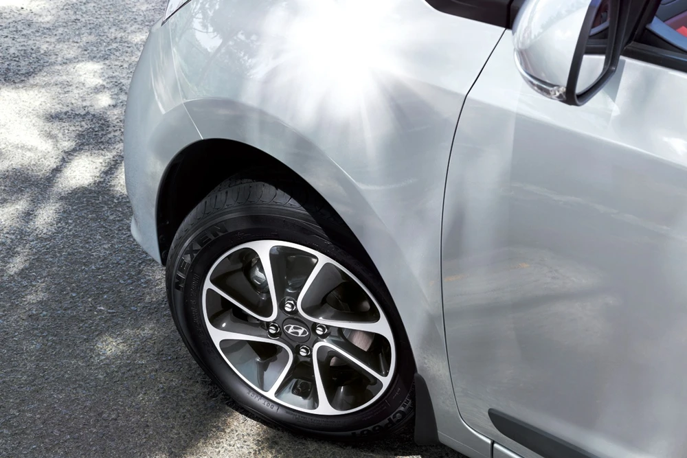 Grand i10 sở hữu cản dưới cùng lưới tản nhiệt kích cỡ lớn giúp tăng cường lượng khí làm mát giúp động cơ đạt hiệu suất tối đa, kết hợp cùng thiết kế cách tân khu vực đèn sương mù và cụm đèn LED chạy ban ngày DRL (Daytime Running Light) tạo nên phong cách thể thao cho chiếc xe. Toàn bộ thân xe được bo tròn phối hợp những đường gân làm nổi bật chiều rộng của xe. Phiên bản Hatchback được trang bị lazang hợp kim bốn chấu kép 14 inch làm tăng thêm tính thể thao, còn phiên bản sedan sở hữu lazang hợp kim 14 inch với nan lớn lịch lãm hơn.