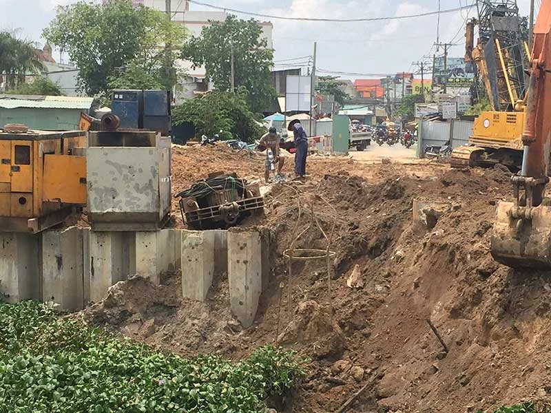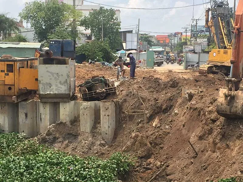Đến nay công trình cầu và nút hai đầu mới chỉ làm được các cọc trụ âm dưới nước và hệ cừ chắn vách kênh Tham Lương-Nước Lên. Ảnh: L.ĐỨC