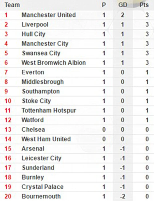 Bảng xếp hạng Premier League sau vòng đấu đầu tiên: