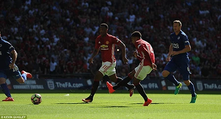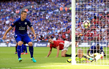 Trong thế trận chặt chẽ hai đội tạo ra, M.U bất ngờ có bàn thắng nhờ khoảnh khắc xuất thần của Lingard. Phút 32, nhận đường chuyền ngang của Rooney từ giữa sân, Lingard bất ngờ đi bóng tốc độ vượt qua hàng loạt cầu thủ Leicester rồi sửa bóng vào góc xa trúng chân thủ thành Schmeichel đi luôn vào lưới. 1-0 cho M.U.