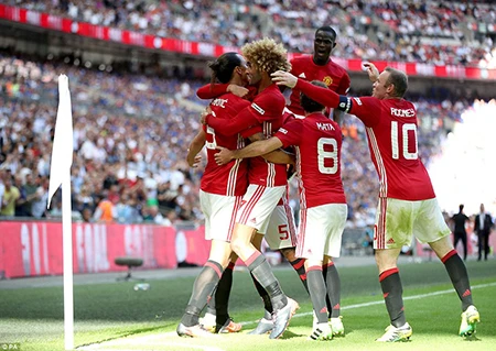 Các cầu thủ Man United vui mừng với danh hiệu đầu tiên dưới thời Mourinho.