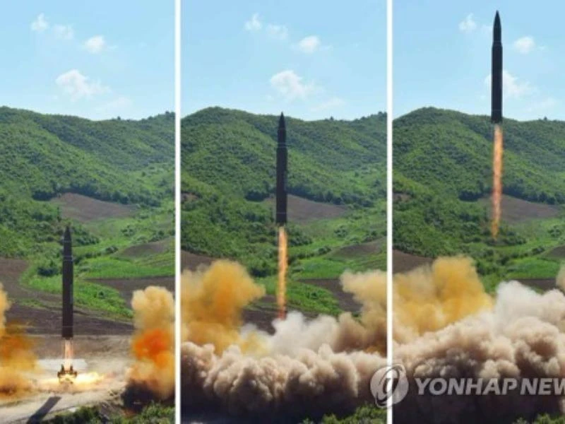 Vụ phóng tên lửa đạn đạo xuyên lục địa Hwasong-14 hôm 4-7 của Triều Tiên. Ảnh: YONHAP