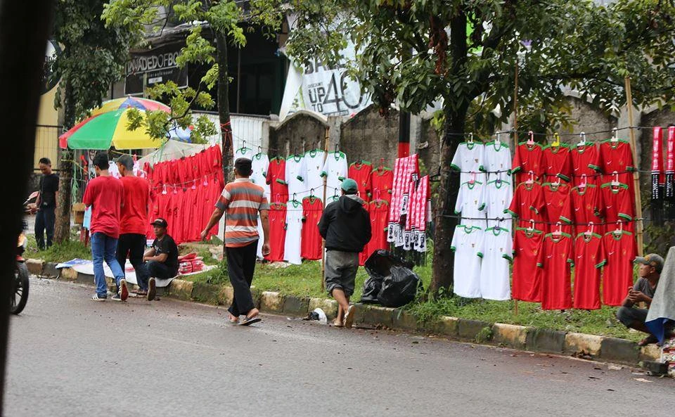 Rất nhiều áo đấu, biểu trưng,.. của chủ nhà Indonesia được bán bên phía ngoài sân vận động. Ảnh: ANH ĐỒNG