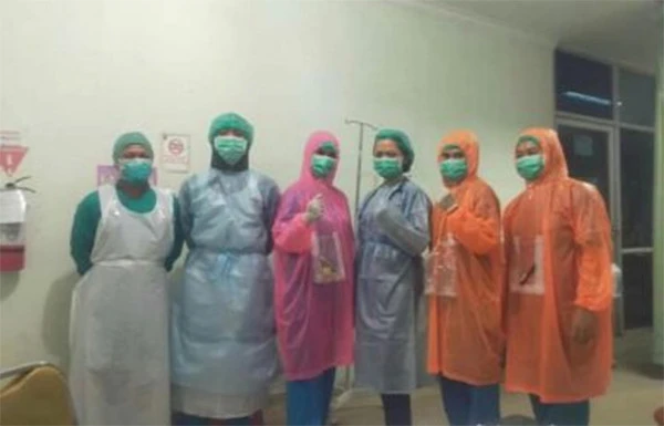 Nhân viên y tế tại một phòng khám cộng đồng ở Bogor, Indonesia phải mặc áo mưa đề phòng lây nhiễm COVID-19 do thiếu đồ bảo hộ. Ảnh: Istimewa