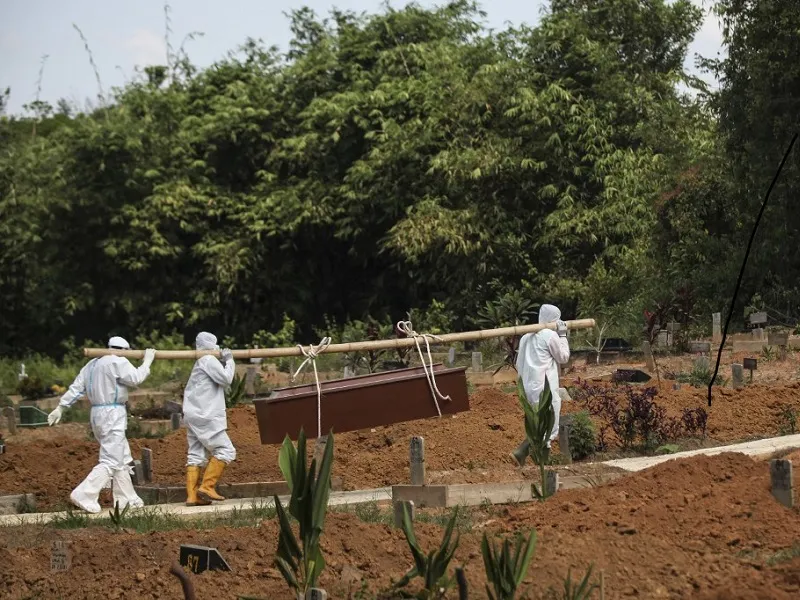 Nhân viên y tế chôn cất một bệnh nhân COVID-19 tại Indonesia. Ảnh: AFP