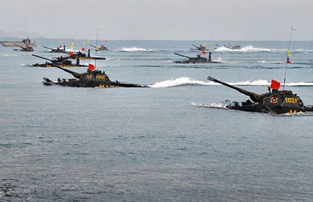 Xe tăng lính thủy đánh bộ Indonesia tập trận trên bãi biển Latgab Banongan ở tỉnh Đông Java (Indonesia) hôm 4-6. Ảnh: ANTARA
