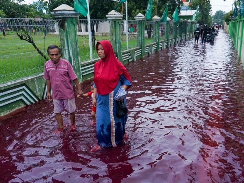 Ngày 6-2, người dùng mạng xã hội Indonesia lan truyền những hình ảnh về trận lụt ở làng Jenggot, phía nam Pekalongan, bị ngập trong biển nước màu đỏ thẫm. Nhiều người liên tưởng màu nước này với màu máu.