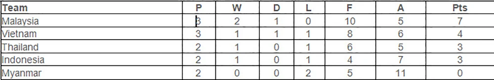Việc Indonesia bất ngờ thua Malaysia khiến cho cơ hội trở lại đường đua vô địch của Thái Lan là rộng nhất. Dù Malaysia đang đứng đầu bảng (năm đội đá vòng tròn), Việt Nam xếp nhì, Thái Lan xếp ba nhưng đội này lại đá ít hơn một trận.
