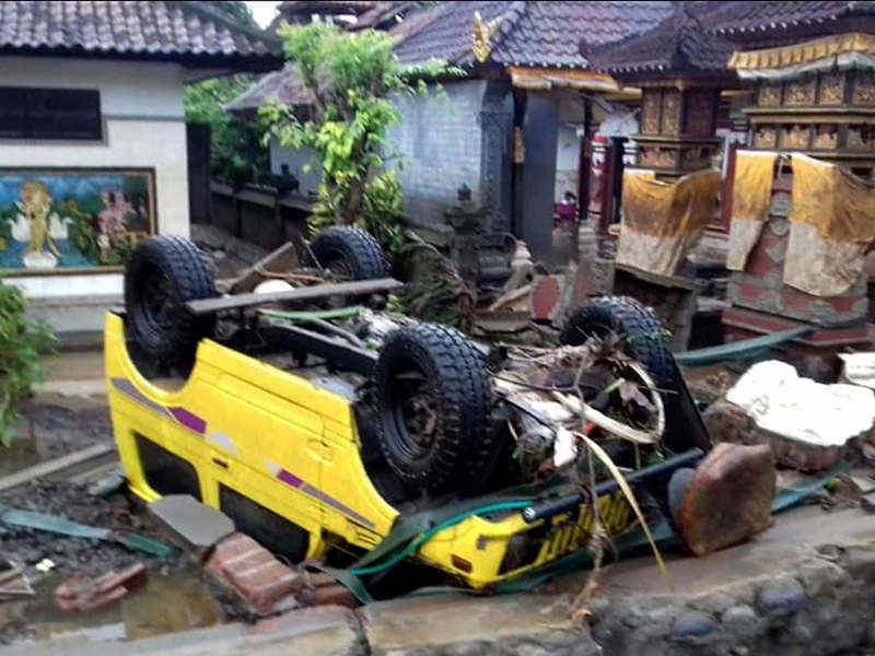 Xe cộ lật tung sau khi sóng thần tràn vào các bãi biển dọc eo biển Sunda (Indonesia) khuya 22-12. Ảnh: AP