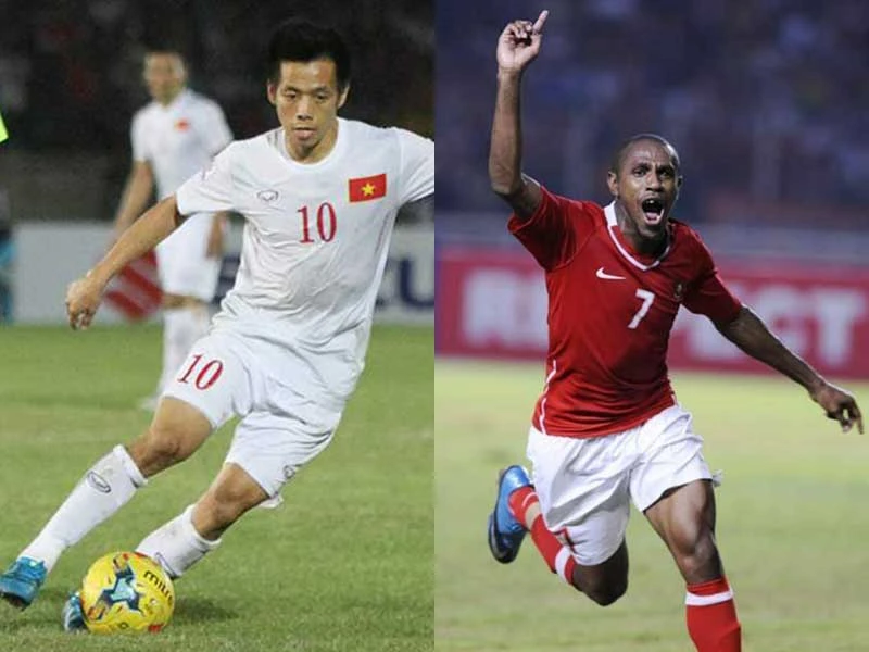 Văn Quyết quân bình 1-1 từ chấm 11 m nhờ pha ngã láu lỉnh của Công Vinh (ảnh trái).Nhưng đầu hiệp 2 thì Salossa nâng tỉ số 2-1 cũng từ chấm 11 m, tạo ưu thế cho Indonesia trước lượt về. Ảnh: AFF NEWS