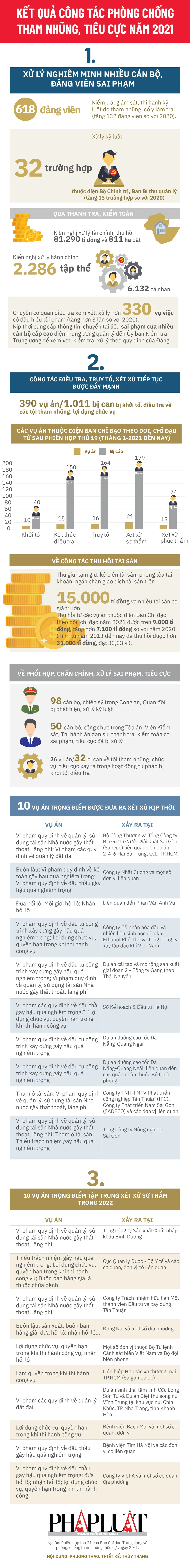 (PLO)- Công tác phòng, chống tham nhũng, tiêu cực trong năm 2021 tiếp tục được đẩy mạnh, đạt nhiều kết quả rõ rệt. Năm 2022, Tổng Bí thư Nguyễn Phú Trọng đề nghị tập trung chỉ đạo kết thúc điều tra 16 vụ án, đưa ra xét xử sơ thẩm 22 vụ án trong đó có 10 vụ án trọng điểm...