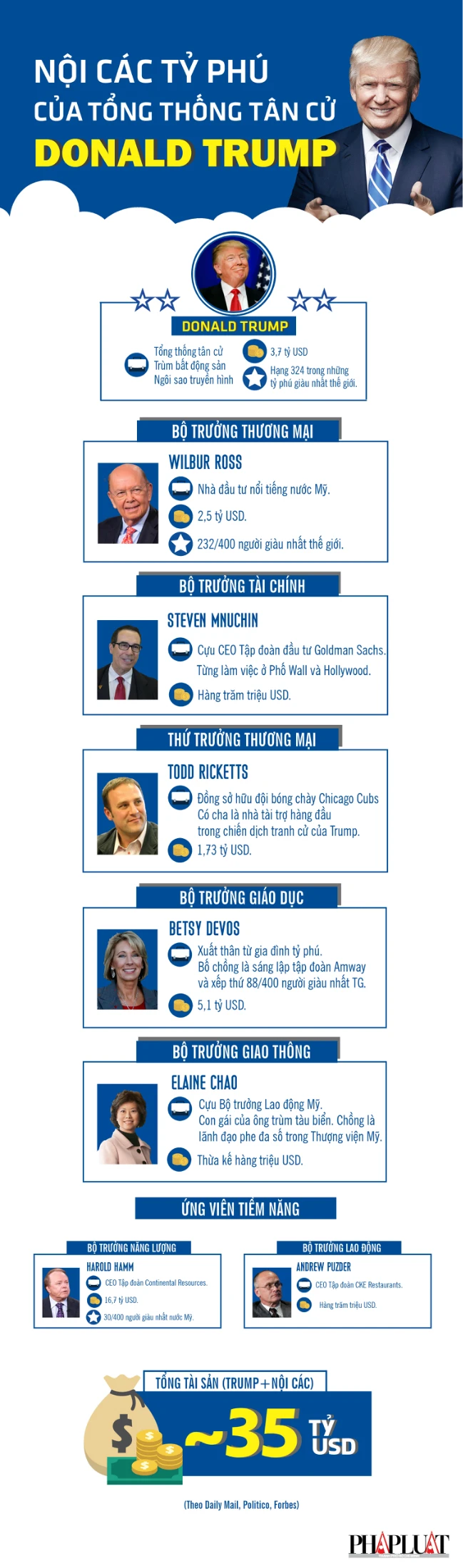 Các thành viên và ứng cử viên sáng giá cho nội các của ông Trump, đặc biệt là các ngành đối nội, có nhiều gương mặt là tỉ phú, triệu phú nổi tiếng ở Mỹ.