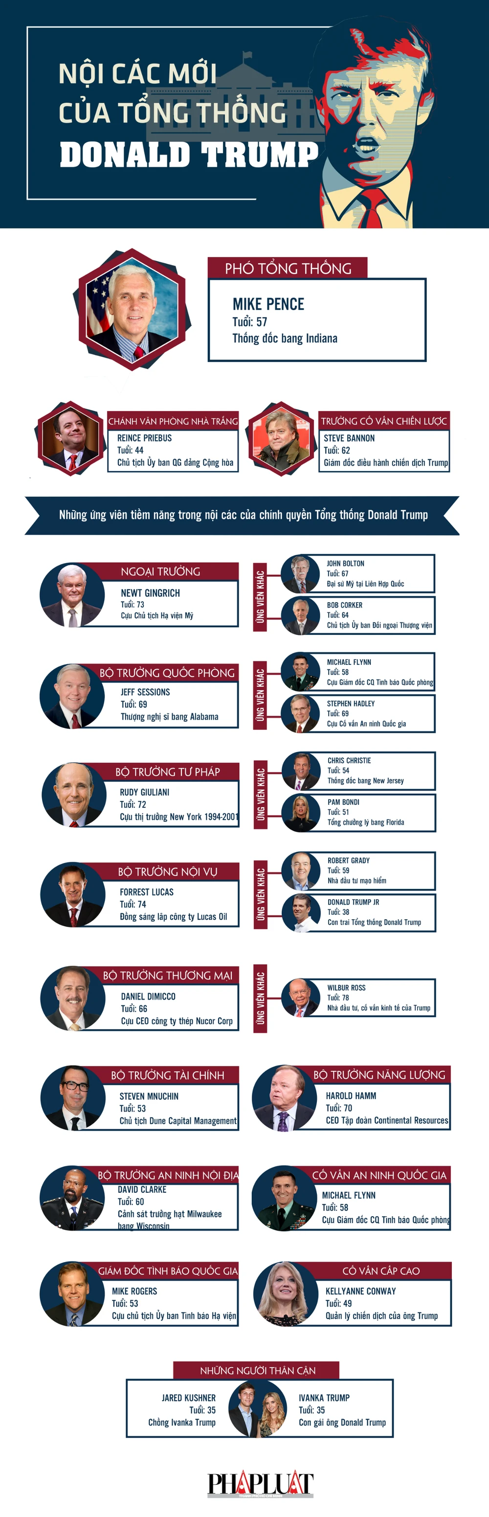 Các ứng viên hàng đầu cho những vị trí lãnh đạo nội các của tổng thống tân cử Donald Trump dần hé lộ. Riêng người con gái Ivanka và chồng hiện vẫn chưa rõ sẽ nắm vai trò gì trong các quyết sách tương lai.