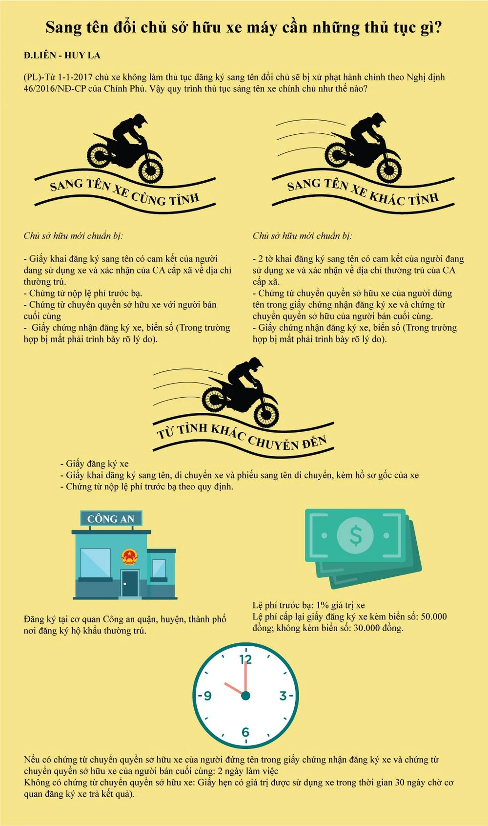 (PLO)- Từ 1-1-2017 chủ xe không làm thủ tục đăng ký sang tên đổi chủ sẽ bị xử phạt hành chính theo Nghị định 46/2016/NĐ-CP của Chính Phủ. Vậy quy trình thủ tục sang tên xe chính chủ như thế nào?