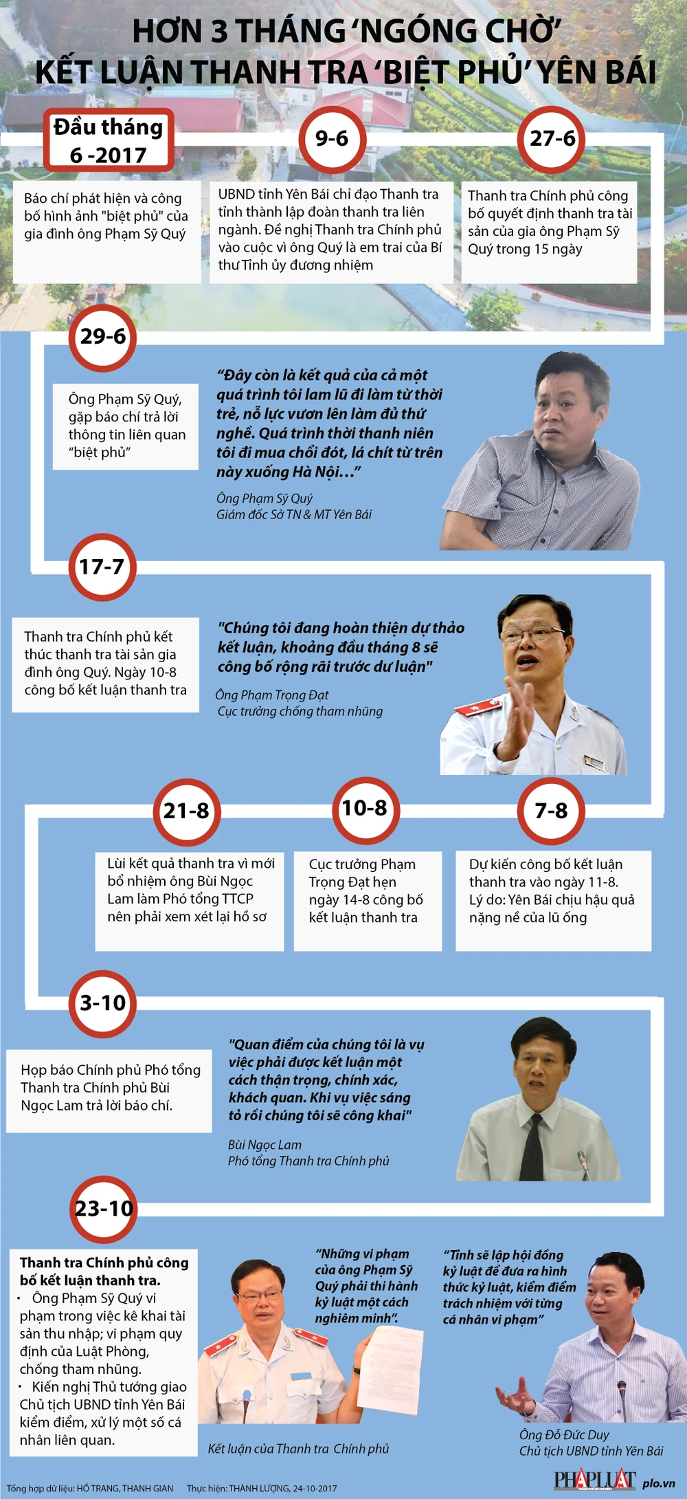 (PLO)- Tại buổi công bố kết luận thanh tra biệt phủ Yên Bái, chủ tịch UBND tỉnh Yên Bái cho biết lãnh đạo và người dân ngóng chờ kết luận của Thanh tra Chính phủ suốt ba tháng kể từ khi cuộc thanh tra kết thúc ngày 19-7. Cùng nhìn lại toàn bộ quá trình thanh tra tài sản của ông Phạm Sỹ Quý, Giám đốc Sở TN&MT tỉnh Yên Bái.