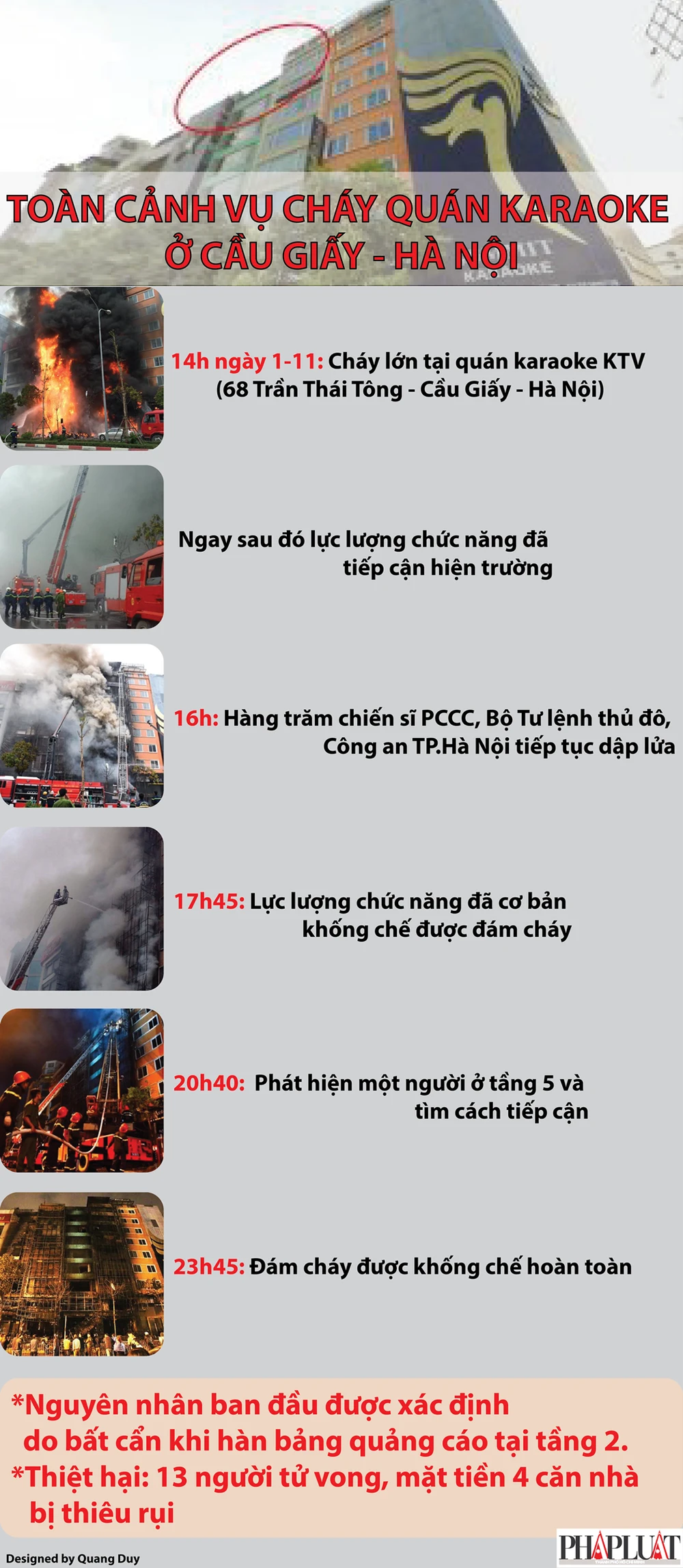 (PLO)- Đám cháy bùng phát vào khoảng 14 giờ chiều 1-11, xuất phát từ quán karaoke KTV ngõ 1 Trần Thái Tông (Cầu Giấy, Hà Nội). Thiệt hại về nhân mạng quá thảm khốc với 13 người tử nạn. Hiện nguyên nhân vụ cháy vẫn được tiếp tục làm rõ.