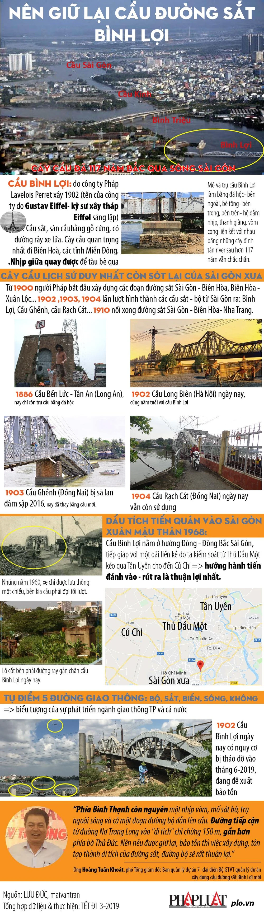 (PLO)- Tháng 6-2019 tới khi làm xong cầu mới sẽ tháo dỡ cầu cũ đã 117 năm tuổi. Theo ông Hoàng Tuấn Khoát, phó Tổng giám đốc Ban quản lý dự án 7 (đại diện Bộ GTVT quản lý dự án xây dựng cầu đường sắt Bình Lợi mới), Ban có đề xuất không tháo dỡ hết cầu cũ mà sẽ giữ lại, bảo tồn một phần cầu phía bờ quận Bình Thạnh.