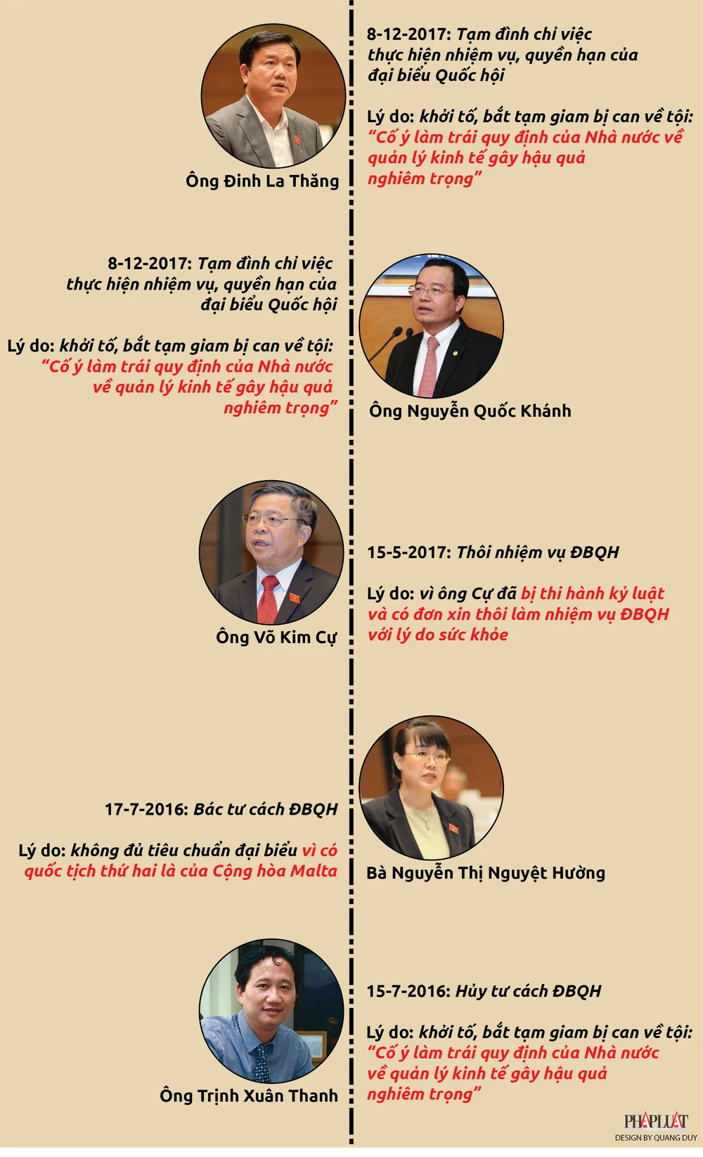 (PLO)- Tính đến nay đã có năm đại biểu Quốc hội khóa XIV bị bãi miễn, cho thôi nhiệm vụ hay tạm đình chỉ nhiệm vụ làm đại biểu Quốc hội, trong đó có ông Đinh La Thăng và ông Nguyễn Quốc Khánh, hai cá nhân vừa bị Ủy ban Thường vụ Quốc hội quyết định tạm đình chỉ nhiệm vụ, quyền hạn đại biểu Quốc hội vào chiều nay (8-12).