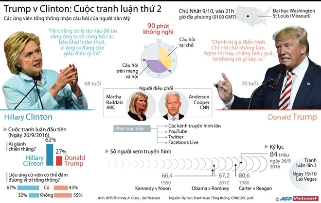 Chính trường Mỹ tiếp tục chứng kiến những ngày sôi động với cuộc tranh luận trực tiếp thứ hai dự kiến diễn ra vào ngày 9-10 tới theo giờ Mỹ (tức sáng 10-10 theo giờ Việt Nam) giữa ứng cử viên tổng thống của đảng Dân chủ Hillary Clinton và đối thủ của đảng Cộng hòa Donald Trump.