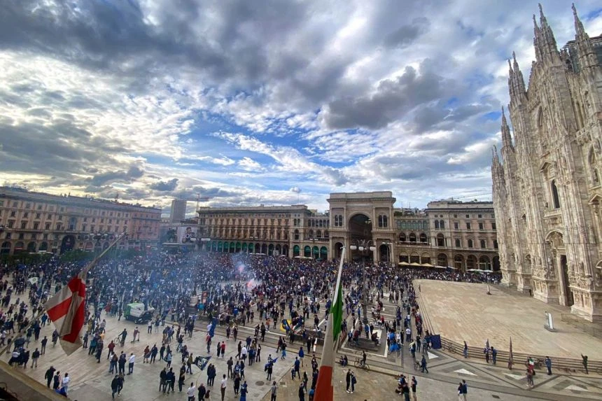 Bất chấp dịch bệnh đang hoành hành, hàng ngàn fan Inter đổ ra quảng trường, đường phố ăn mừng danh hiệu sau 11 năm xa cách.