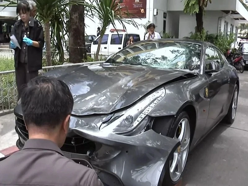 Chiếc xe Ferrari của Vorayuth Yoovidhya - người thừa kế Red Bull - được nhìn thấy sau vụ tai nạn năm 2012. Ảnh: AFP