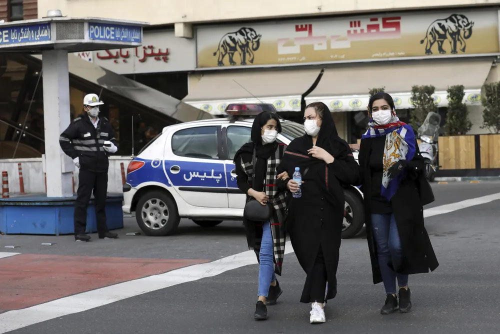 Người dân Iran đeo khẩu trang khi đi bộ trên đường phố Tehran ngày 22-2. Ảnh: AFP