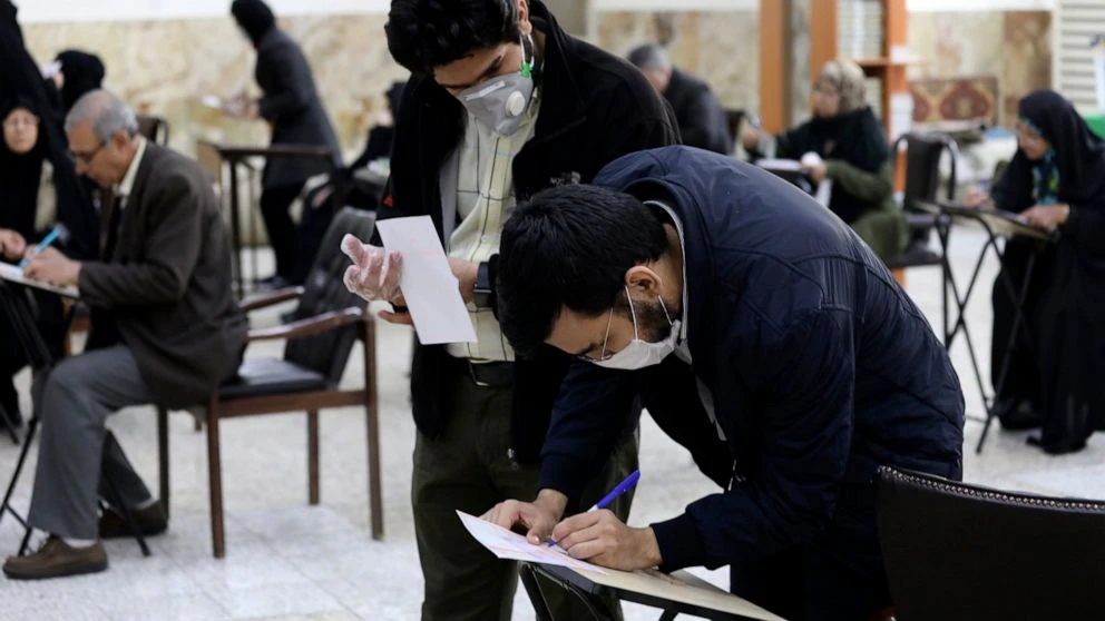 Cử tri ở Iran mang khẩu trang đi bỏ phiếu. Ảnh: AP