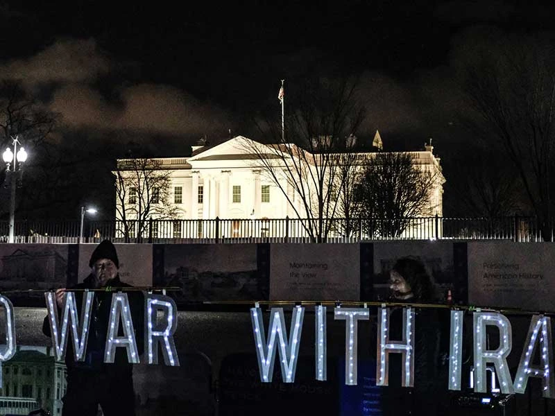 Bảng đèn mang dòng chữ “Không chiến tranh với Iran” được giăng trước Nhà Trắng tối 7-1 (giờ Mỹ) sau khi Iran nã tên lửa vào hai căn cứ của Mỹ ở Iraq. Ảnh: GETTY IMAGES