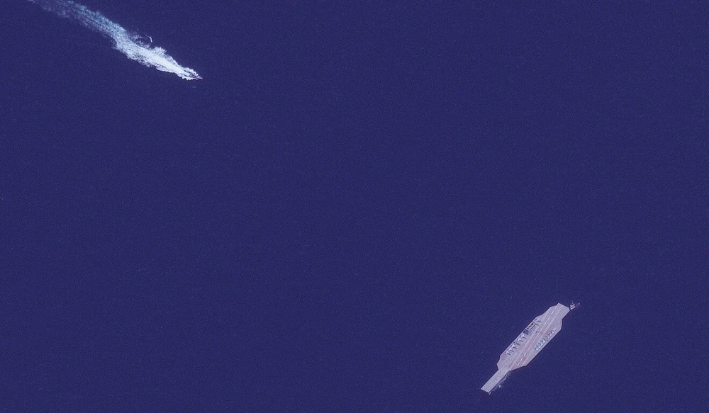 Ảnh vệ tinh cho thấy xuồng cao tốc Iran (phía trên bên trái) đang tiếp cận mô hình tàu sân bay của Mỹ. Ảnh: AP