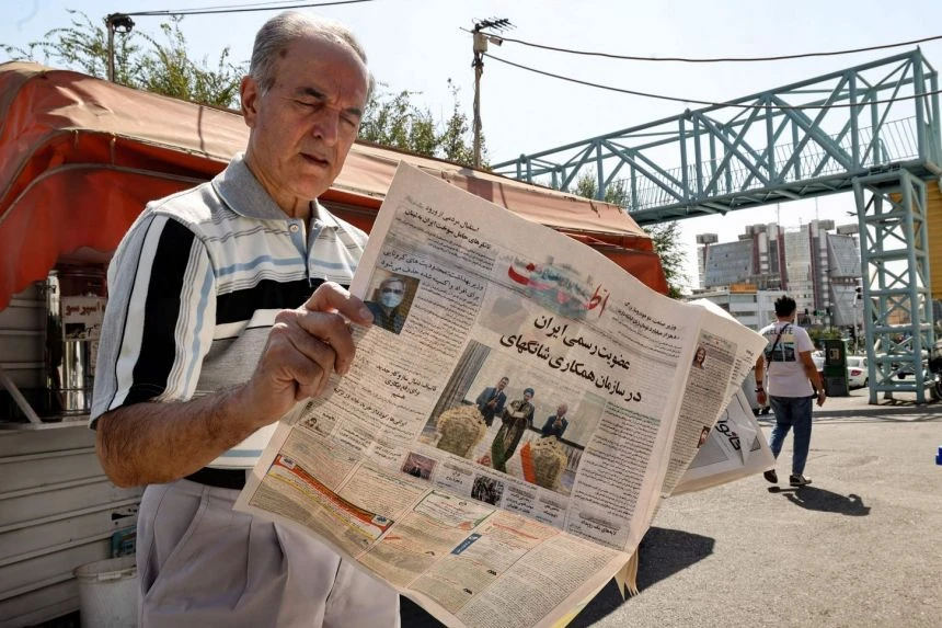 Một người dân Iran đọc số báo ETALAAT ngày 18-9, trong đó dòng tít lớn là "Iran là thành viên mới của Tổ chức Hợp tác Thượng Hải". Ảnh: AFP