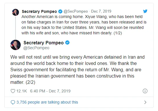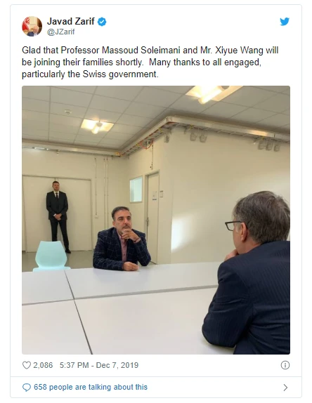 Bộ trưởng Ngoại giao Iran Mohammad Javad Zarif đăng lên mạng xã hội của mình ngày 7-12, nói rằng Iran và Mỹ đang tiến hành trao đổi hai tù binh, nhà khoa học Iran Massoud Soleimani và giáo sư người Mỹ gốc Hoa Xiyue Wang.