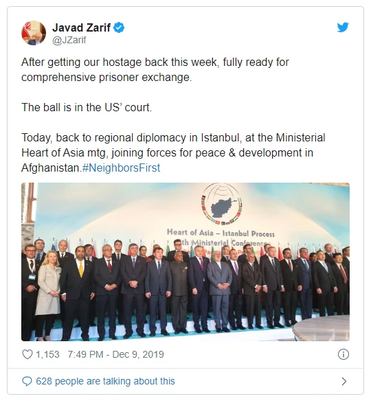 Bộ trưởng Ngoại giao Iran Mohammad Javad Zarif đăng lên mạng xã hội của mình ngày 7-12 rằng Iran và Mỹ đang tiến hành trao đổi hai tù binh. Ảnh: Twitter