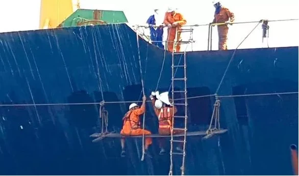 Công nhân đang đổi tên cho tàu Grace 1. Ảnh: Express