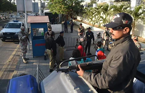 Cảnh sát tăng cường bảo vệ sứ quán Saudi Arabia tại Karachi (Pakistan). Ảnh: AFP