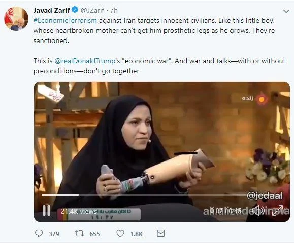 “Chính sách khủng bố kinh tế lên Iran là nhắm mục tiêu vào người dân vô tội. Như một cậu bé mà người mẹ của cậu bất lực không thể cho cậu một đôi chân giả khi cậu lớn. Họ đã bị trừng phạt”, Ngoại trưởng Iran Mohammad Javad Zarif viết trên Twiiter ngày 3-6.