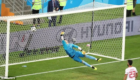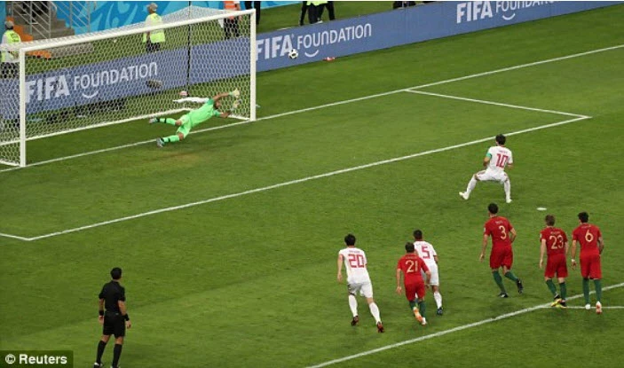 Sau những giây chờ đợi căng thằng, trọng tài chỉ tay vào chấm 11m trong sự phản đối của nhiều cầu thủ Iran. Phút 53, trên chấm 11m, Ronaldo sút bóng vào góc phải nhưng thủ thành Beiranvand đã chơi quá xuất thần bay người cản phá thành công. Ở tình huống này, Beiranvand đã bay về bên phải ngay trước khi Ronaldo thực hiện cú sút.