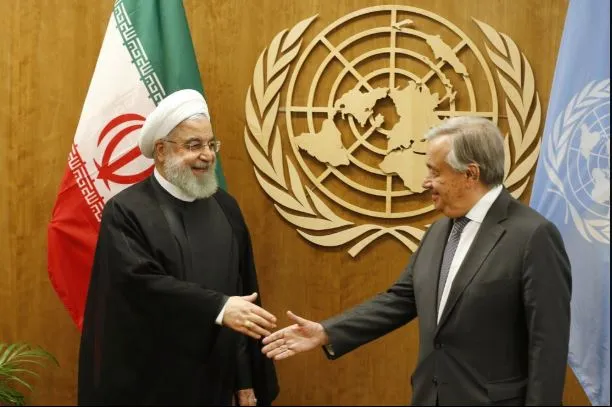 Tổng thư ký Antonio Guterres chào đón tổng thống Iran tại kỳ họp lần thứ 74 của Đại Hội đồng Liên Hiệp Quốc. Ảnh: AP