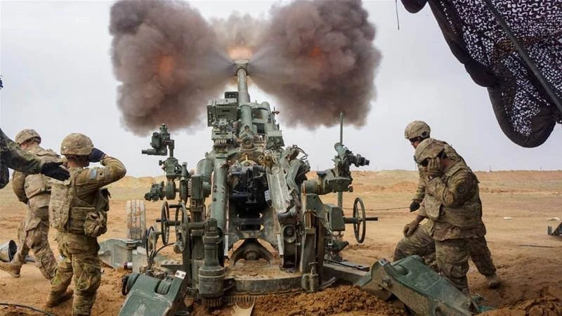 Lính Mỹ bắn một khẩu pháo M777 trên căn cứ hỏa lực Saham ở Iraq. Ảnh: DVIDS