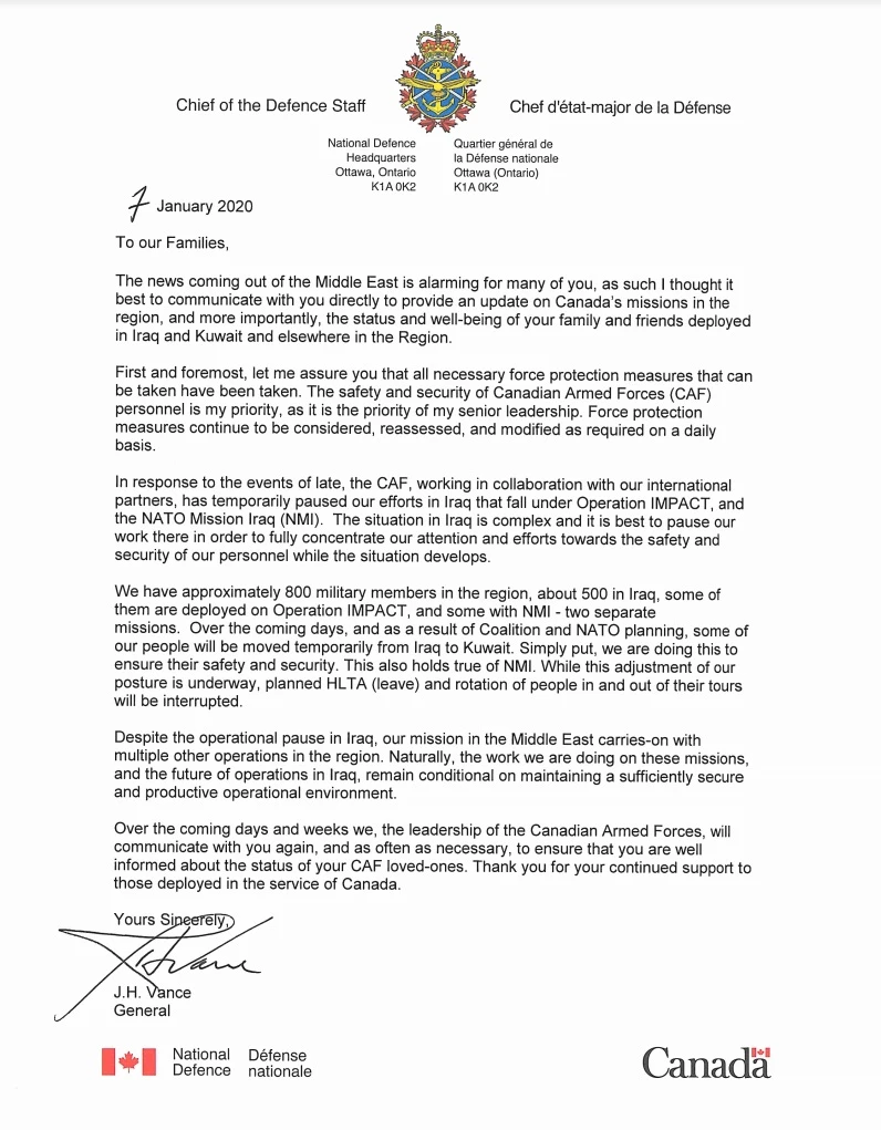 “Với tình hình hiện này, quân đội Canada (CAF) hiện đang hợp tác với các đồng minh quốc tế đã tạm thời tạm dừng các hoạt động tại Iraq trong Chiến dịch IMPACT và Phái bộ huấn luyện NATO tại Iraq (NMI)”, Tổng tham mưu trưởng quân đội Canada Jonathan Vance tuyên bố.