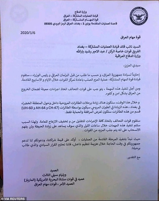 Như tin đã đưa, bức thư xuất hiện một ngày sau khi Quốc hội Iraq bỏ phiếu phê chuẩn nghị quyết yêu cầu quân đội Mỹ và liên minh rời khỏi nước này do vụ việc tướng hàng đầu Iran Qassem Soleimani bị ám sát tại sân bay quốc tế Baghdad.