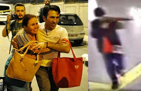 Hành khách hoảng sợ chạy ra khỏi sân bay Ataturk và hình ảnh một tên khủng bố xả súng trước khi kích nổ bom. Ảnh: DAILY MAIL - GETTY IMAGES